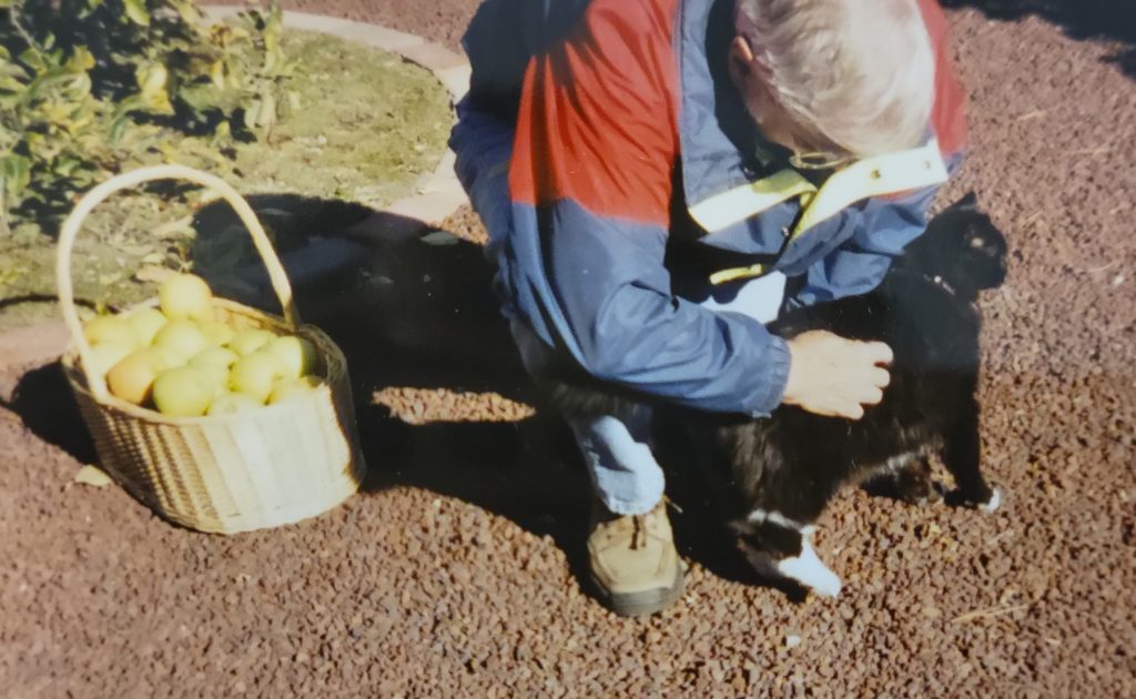 While Hal was harvesting his apples, our neighbor’s cat “Boots” came out to visit my Hal and they had some petting time. Boots liked Hal, whenever our neighbor would be gone for a few days, my Hal would look after him and feed him. They became good friends. Boots had a beautiful black coat and had four white paws. Boots came out to explore the apple tree, keep Hal company and made sure every apple was picked.